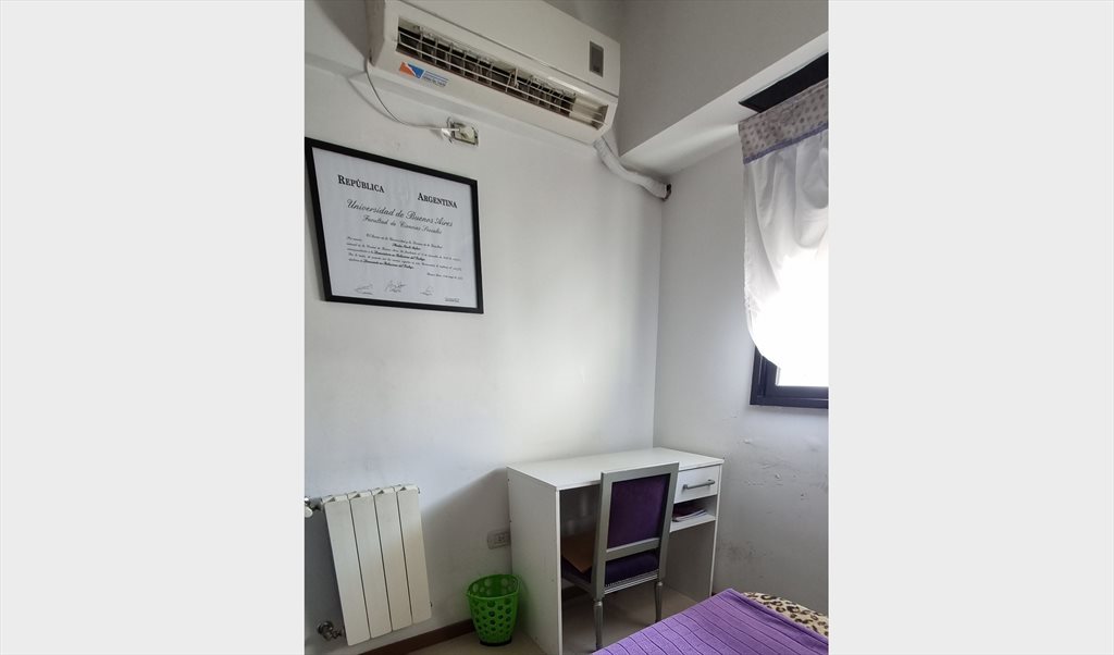 Departamento de 15 años de antiguedad 3 ambientes a metros de las paradas de colectivos y el subte linea B La habitación cuenta con Aire acondicionado frio/calor, muy luminoso, placard de pared a pared, con espejo, cama de 2 plazas, y escritorio.