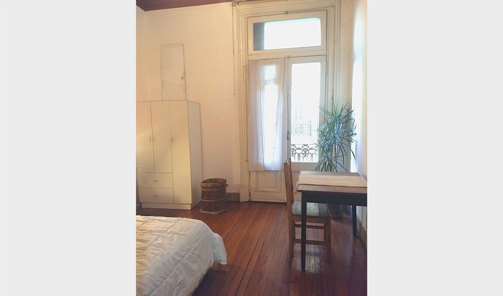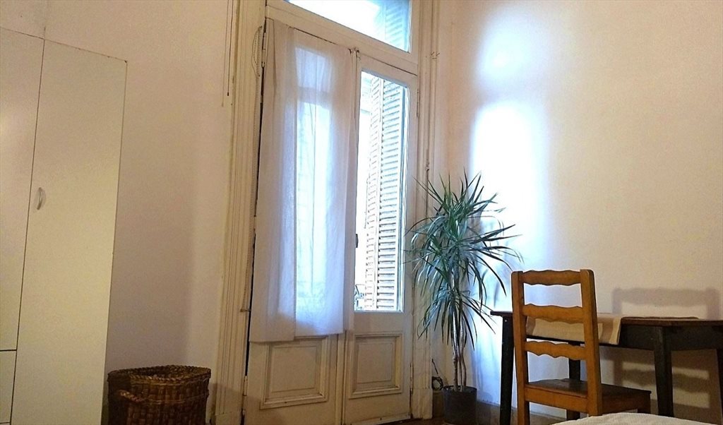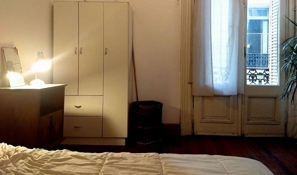 Habitación con cama doble. escritorio, placard. Ropa de cama. Balcón a la calle. La habitación es muy luminosa. El living también tiene balcón a la calle. Tiene un sillón, mesas-sillas.