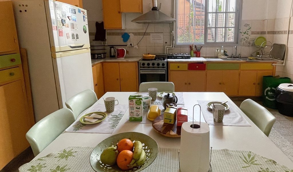 La cocina es muy amplia. con lugar para guardar los víveres personales, y cocinar con comodidad. Se compartirá con cuatro huéspedes tranquilas que estudian y trabajan. Lavarropas grande disponible para todas, y sector de secado de ropa en la terraza.