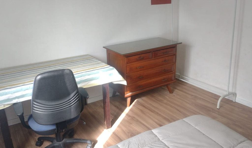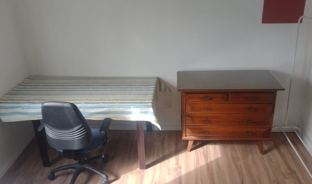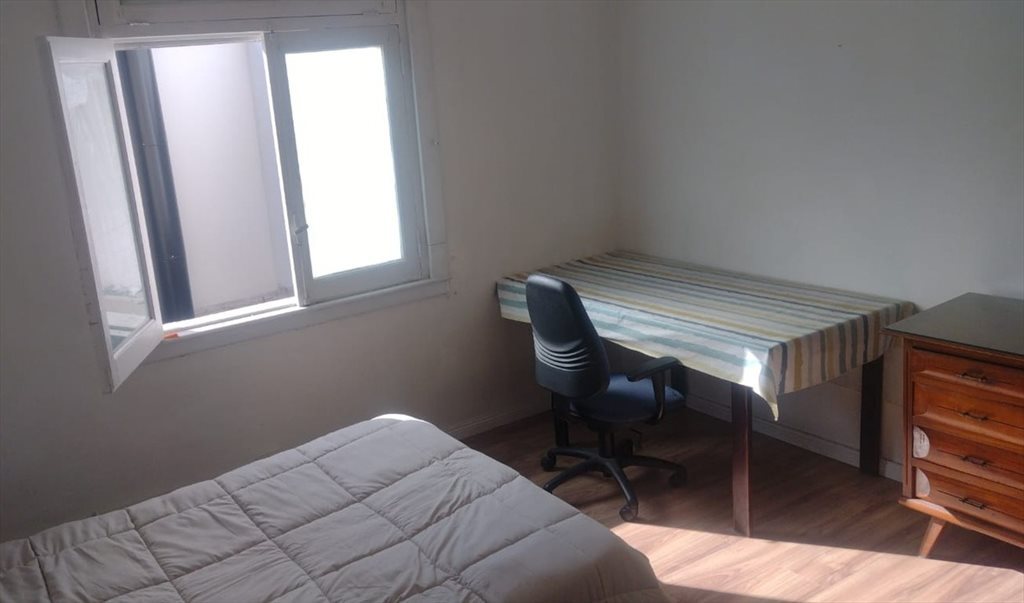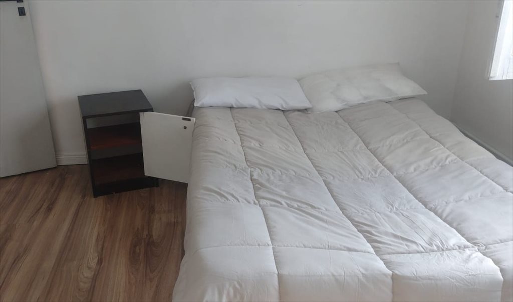 -Habitación recién pintada, un ventilador, una cama doble plaza de 190cm x 130cm, 2 almohadas, 1 Edredón, 1 mesa de 180 x 80cm, cajonera de pinotea, perchero abierto el cual se puede cambiar por uno cerrado de pinotea con otra cajonera.